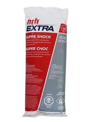 75% Super Shock for swimming pools. This chlorine provide you a shock treatment or superchlorinatied water, as well as effective wintertime treatment. The Super Shock is a high purity salt used to generate chlorine. HTH Extra Super Shock is fast acting and powerful HTH Extra Super Shock contains 75 available chlorine, making it 15 stronger than regular HTH Shock Its fast dissolving, extra fine formula is made with a patented process that makes it perfect for weekly shock treatments and killing algae. No need for messy liquid chlorine for sanitizing your pool, HTH EXTRA is easier to store and use. 1 pouch is approximately equivalent to 10 liters of liquid chlorine Features Benefits Compatible with chlorine, ozone, mineral systems and salt water pools Calcium Hypochlorite Contains 75 available chlorine Fast dissolving, extra fine formula – no need to pre-dissolve Perfect for weekly shock treatments Kills algae Always test and ensure pH is between 7.2 and 7.6 before shocking your pool. Test your chlorine levels regularly, and use a shock treatment after heavy use of your pool or after rain fall, as rain water can introduce organic contaminants to your pool water.